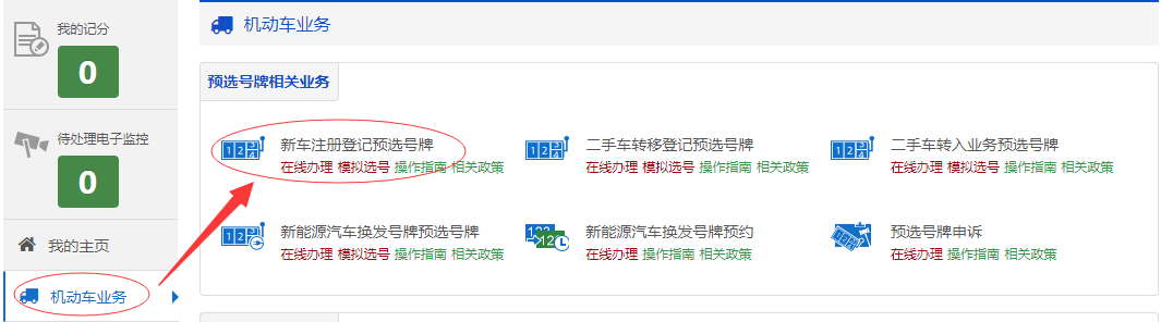 互聯網注冊用戶在互聯網登錄后,點擊【機動車業務】→【新車(含新能源汽車)注冊登記預選號牌】下的【預選號牌】進入預選號牌流程。如下圖所示。