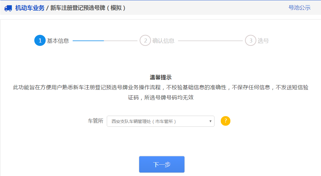 如上圖所示,如果用戶不熟悉預選機動車號牌業務操作流程,可點擊“模擬選號”鏈接進入模擬選號功能, 模擬選號功能與正式選號功能流程完全相同,旨在方便用戶熟悉預選機動車號牌業務操作流程, 不校驗基礎信息的準確性,不保存任何信息,所選號牌號碼均無效!用戶正式預選號牌時,須確保基礎信息的準確性! 模擬選號功能界面如下圖所示: