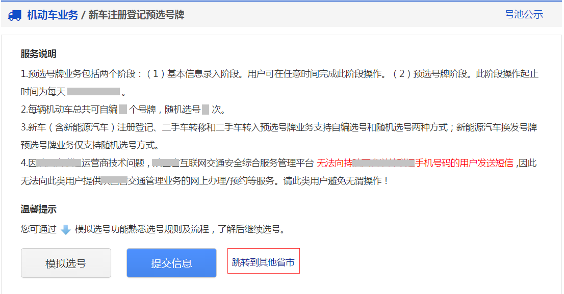 (1)請用戶務必認真閱讀業務須知,知曉預選號牌號碼有效期、信息錄入要求以及其他內容。