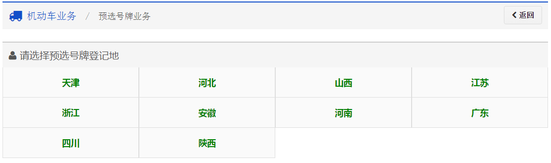 異地預選號牌: 針對新車車主、單位用戶,只能在用戶注冊地辦理預選機動車號牌業務。 對于車主/駕駛人用戶、窗口注冊用戶,登錄互聯網服務平臺后,可以通過預選號牌服務說明頁面中的“跳轉到其他省市”鏈接進入異地預選號牌跳轉頁面。