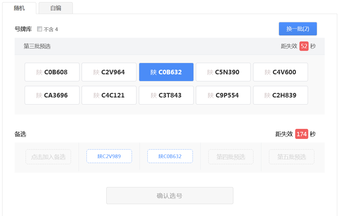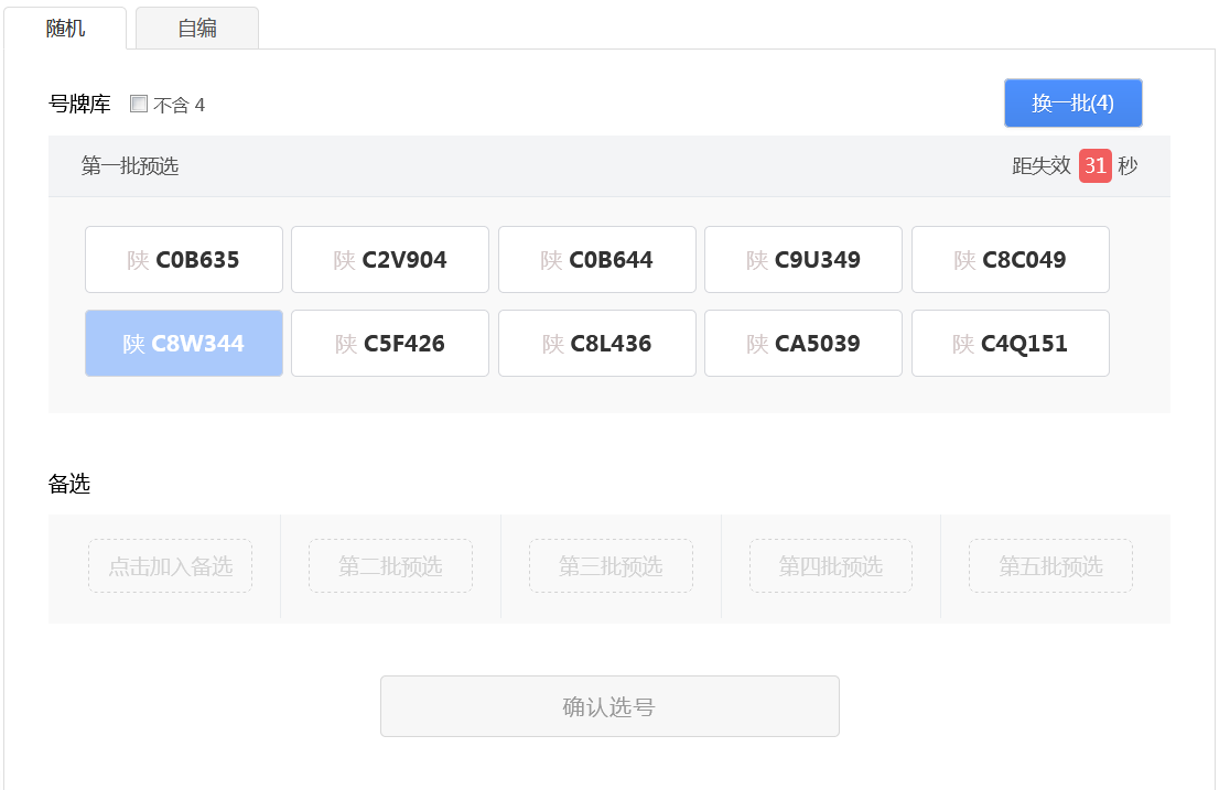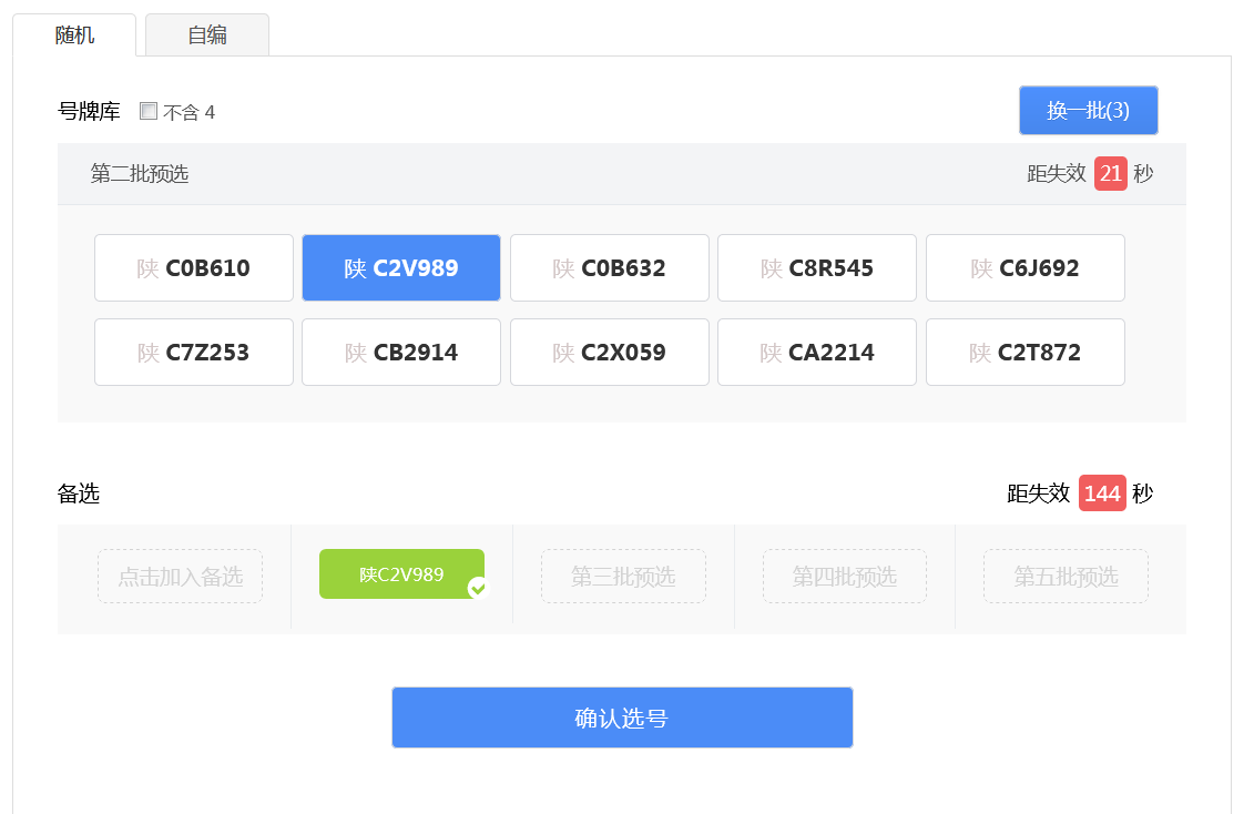 用戶可以點擊右上角“換一批”按鈕重新進行隨機(“換一批”后面的括號中的數字為用戶當前選號車輛的剩余隨機選號次數),此時會更新隨機號牌欄中的號牌。 如果備選號牌欄中的有號牌并且沒有失效,則備選欄中的倒計時將重新開始倒計時。 用戶可以在新隨機的號牌號碼中選擇一個號牌號碼作為備選號牌,此時備選欄中的倒計時也將重新開始倒計時。如下圖所示。 如此循環操作,用戶每次隨機選號,都可以從隨機號牌中選擇一個號牌號碼作為備選號牌,直到隨機選號次數用完。