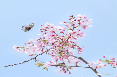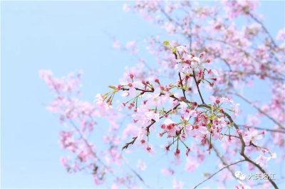 “小園新種紅櫻樹,閑繞花行便當游。何必更隨鞍馬隊,沖泥蹋雨曲江頭。”和煦溫暖的陽光里,藍天白云下的一樹樹櫻花惹人心醉。它紅中透著粉,粉里夾帶著紫,隱忍又優雅,在青蔥樹木的圍繞下,顯得更加迷人。清風掠過,櫻花瓣星落在草叢中,仿佛一個個跳動的音符奏響著歡快的樂章,令人如癡如醉。