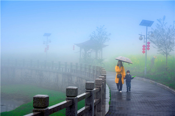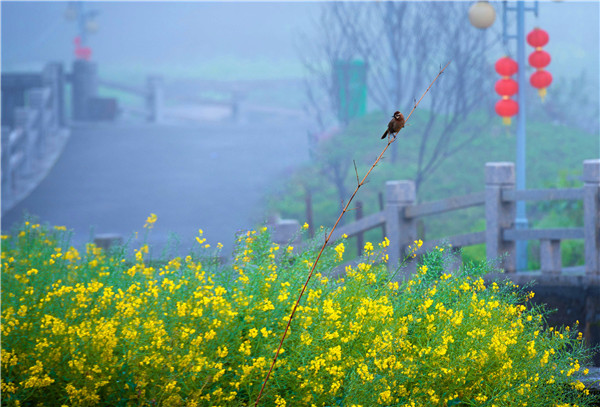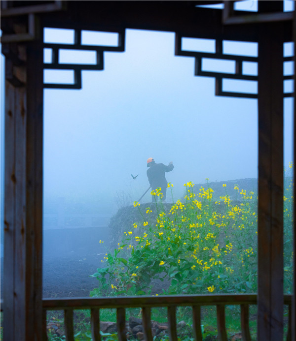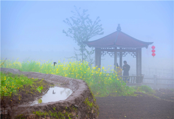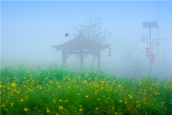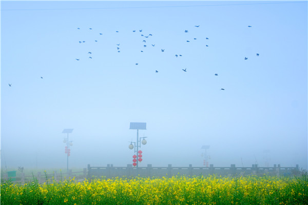 春分前后,福建省泉州市洛江區(qū)虹山鄉(xiāng)的二百多畝油菜花田煙霧繚繞,鳥兒飛飛催早耕,村民忙著刨田灌水,古厝、木亭、溝渠若隱若現(xiàn),勾勒出一幅宛如仙境的畫面。