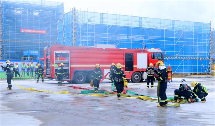 現場還組織消防應急救援實操演練,模擬施工現場用電不規范導致火災。事故發生后,工地迅速啟動消防應急預案,施工單位組建應急救援小組迅速反應,并第一時間請求消防及救護援助。隨后,消防應急車輛和救援隊伍也趕赴現場進行滅火和救援工作。演練過程中,各崗位人員反應迅速,協同配合,疏散過程安全有序。