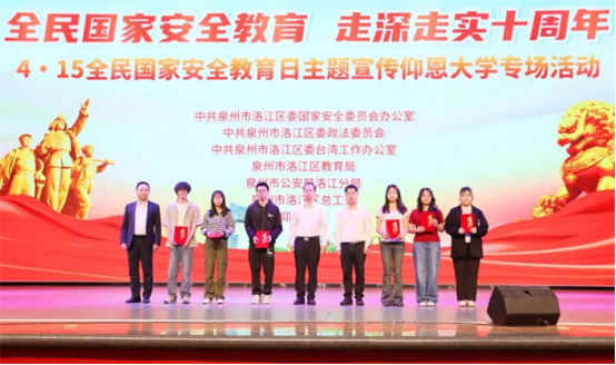活動現場,陳祥昕、張小橋、王維月等有關領導共同啟動2025年洛江區全民國家安全教育日主題宣傳仰恩大學專場活動,并為國家安全主題辯論賽獲獎學生代表頒獎。