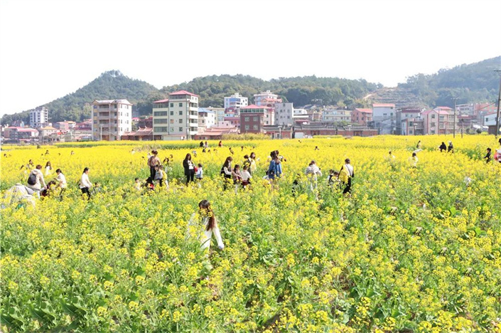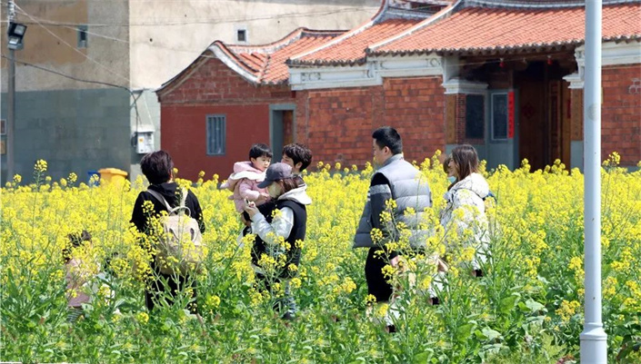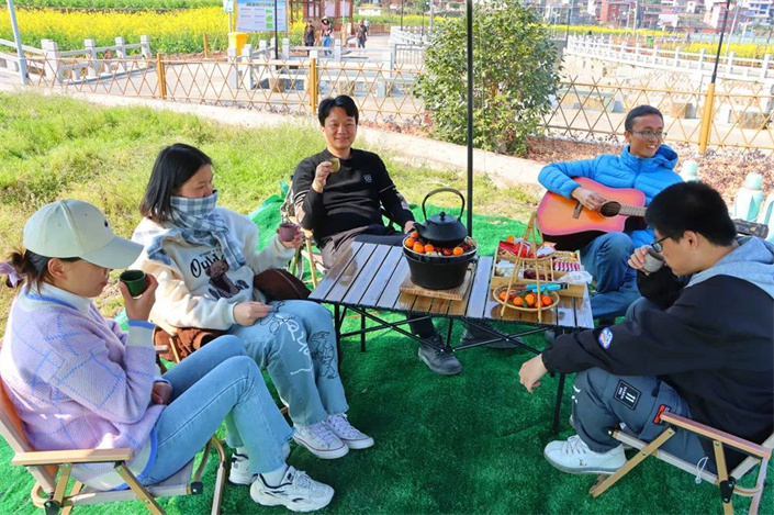 金色花海間,不少市民、游客結伴而行,遠離城市的喧囂,踏上油菜花田的小道,花田中設置浪漫路牌、田野打卡相框等多種特色打卡地,將賞花游融入圍爐煮茶、露營,玩樂的同時品嘗美食,打造一場春日輕松、浪漫之旅,“圈粉”更多年輕市民、親子家庭前來游覽。