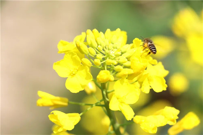 置身油菜花田野,一朵朵油菜花錯落有致地分布在溪邊,蜜蜂也在花間縈繞,花朵隨風搖曳,花香與泥土的芬芳撲面而來,令人心曠神怡。