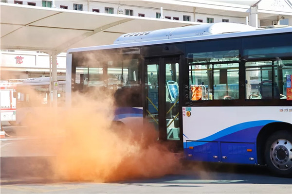 現場模擬了載有乘客的公交車自燃引發的交通事故。隨著刺耳的火情警報聲響起,只見車輛周圍濃煙滾滾,公交公司值班人員迅速報警請求救援。
