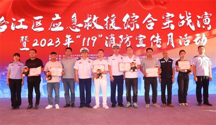 2023年“119”消防宣傳月活動中,與會領導為洛江區“熱心消防公益事業”先進個人和洛江區在市第二屆“小小消防員”兒童繪畫作文大賽中獲獎人員頒發證書和紀念品。